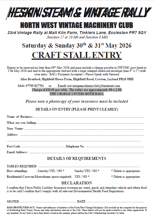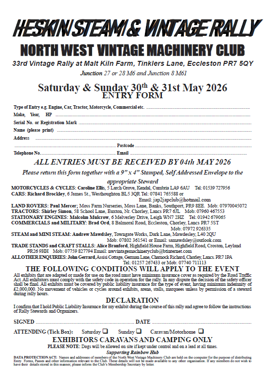 For directions please click here, if you would like exhibit at the rally then please fill in the entry form NWVMC Entry Form. Or for anything else ring John on the number supplied or email us.